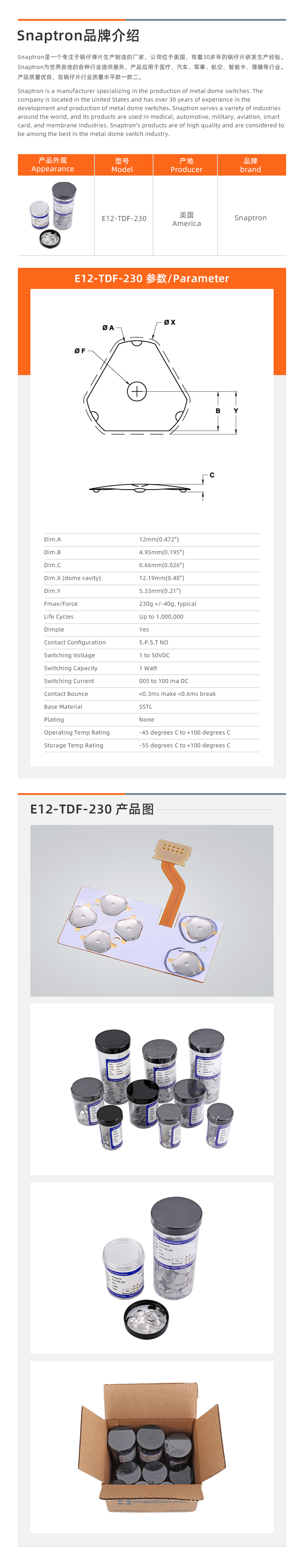 进口Snaptron品牌三角形12mm230克力金属Dome片E12-TDF-230