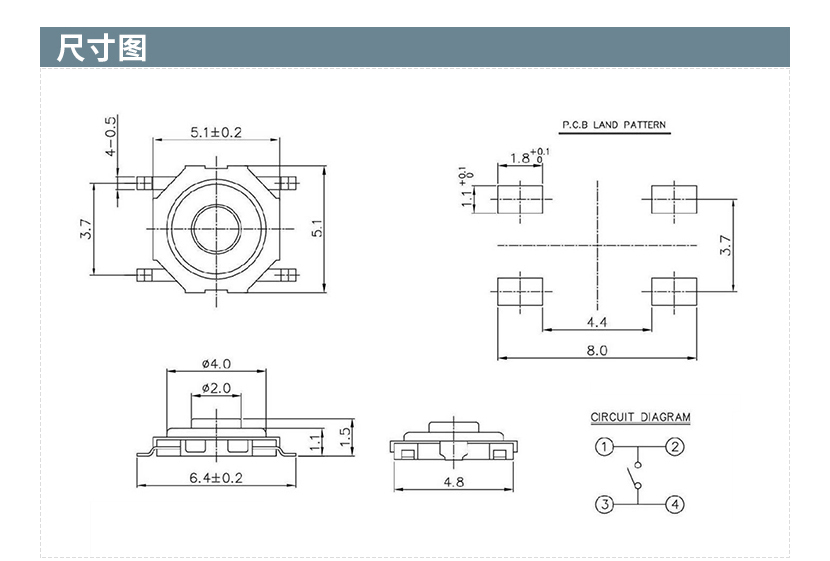 STP-1152四脚5.2*5.2*1.5铜头SMD贴片轻触开关
