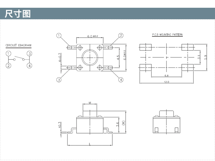 STP-1250S 6*3.5两脚贴片轻触开关