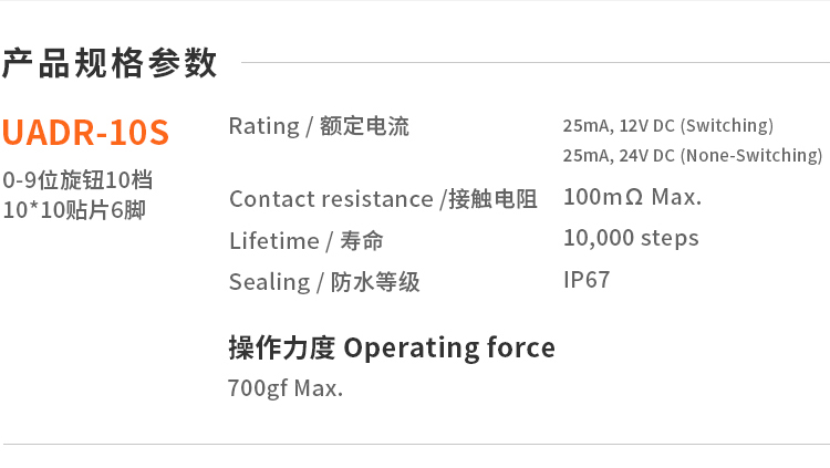 UADR-10S管装0-9位旋钮10档6脚10*10立式贴片旋转编码开关